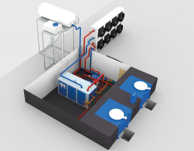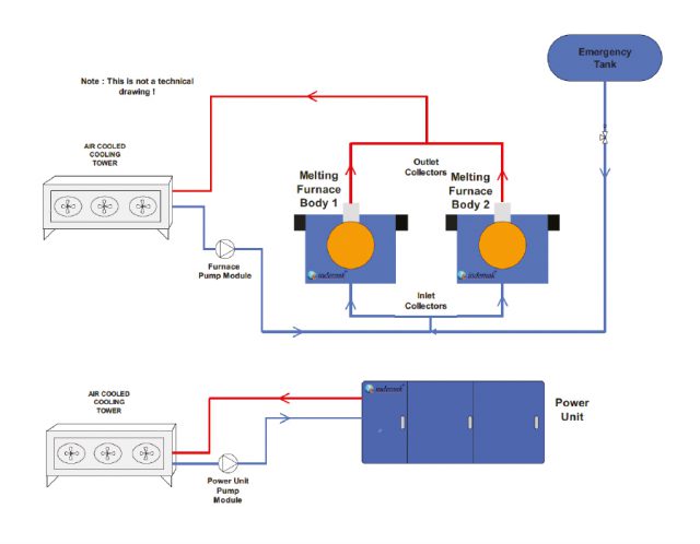 En este tipo de sistemas de refrigeración, el agua de refrigeración de la unidad de potencia y el horno de fusión es un circuito completamente cerrado, y hay dos circuitos de refrigeración, donde el horno de fusión y la unidad de potencia tienen sus propias torres. El agua destilada se puede utilizar en el circuito de la unidad de potencia, y el agua de red (agua blanda) se puede utilizar en el circuito del horno de fusión. Para evitar que el sistema se congele durante las estaciones frías, es necesario agregar mono etilenglicol. En caso de corte eléctrico, se puede usar agua de red o tanque de reserva para enfriar los hornos de fusión. Aparte de estos, las bombas del circuito.