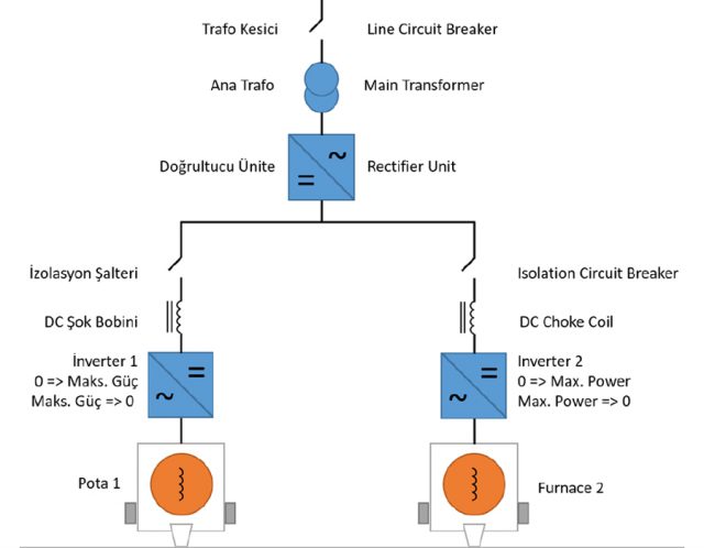 • Ortak doğrultucu kısım ve iki eşit güce sahip invertöre sahip olmasından dolayı, bir ergitme ocağı veya invertörde arıza olması halinde çapraz çalışma imkanı